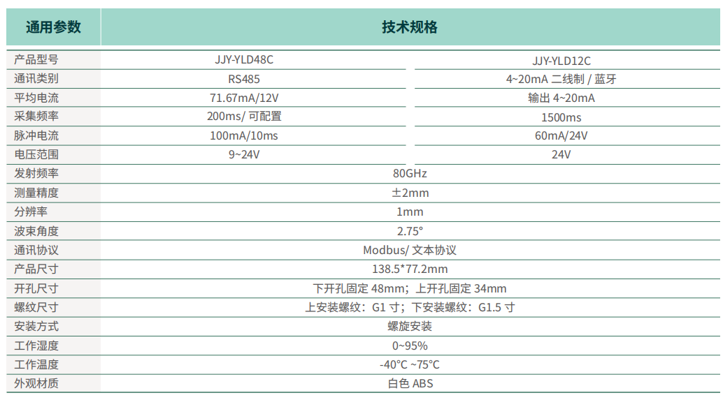 80G 雷达物位计 , 支持 RS485/4-20MA/ 应用。产品最大量程可以达到 40m, 盲区最小可以达 5cm。由于它工作频率更高 , 波长更短 , 尤其适合固体应用 ; 通过透镜发射接收电磁波的工作方式 , 在高粉尘、恶劣温度环境下 (+75° C) 具有独特的优势 ; 仪表提供螺纹的固定方式 , 使得安装便捷简易。